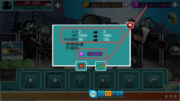 当界面弹出升级提示时,花费【2000】钻石能够把【LV:2】升级到3级,与此同时【HP:1200】和【POWER:90】也会一同增加。