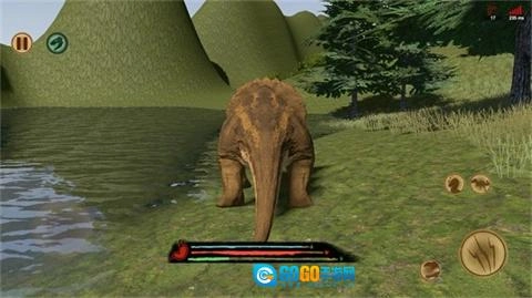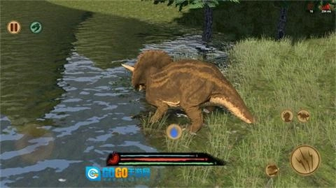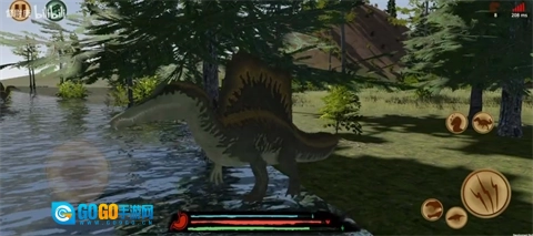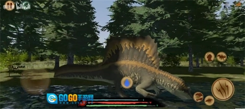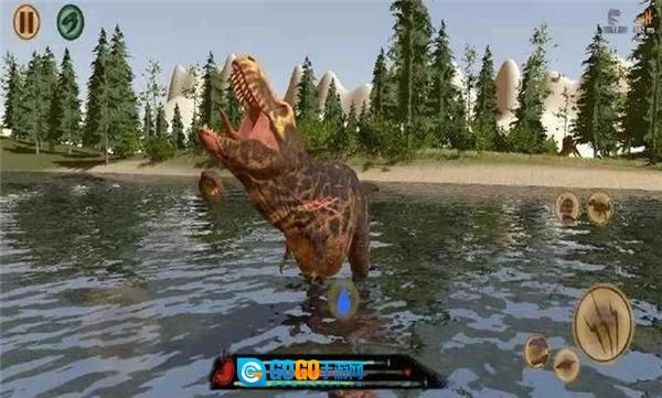1、首先需要操作左下角的摇杆控制恐龙走到水中。