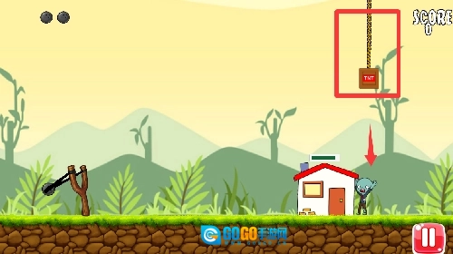3、对准上方的绳子,将炸弹投掷到地面,炸死僵尸即可通关。