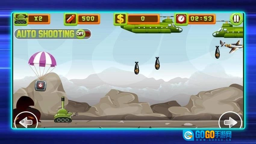 用屏幕上的虚拟摇杆操控坦克移动,巧妙避开从空中落下的炮弹。