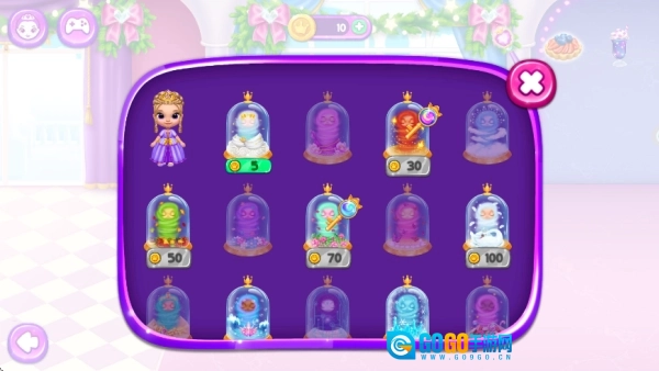 就像图中展示的那样,点击画面左上角的娃娃图标,就能花费金币购买各式各样的公主娃娃。