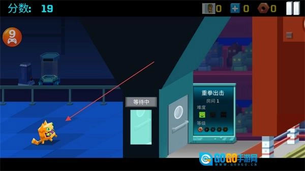 控制黄色角色进行移动,等待进入能够施展重拳攻击的房间,将分数累积到19分。