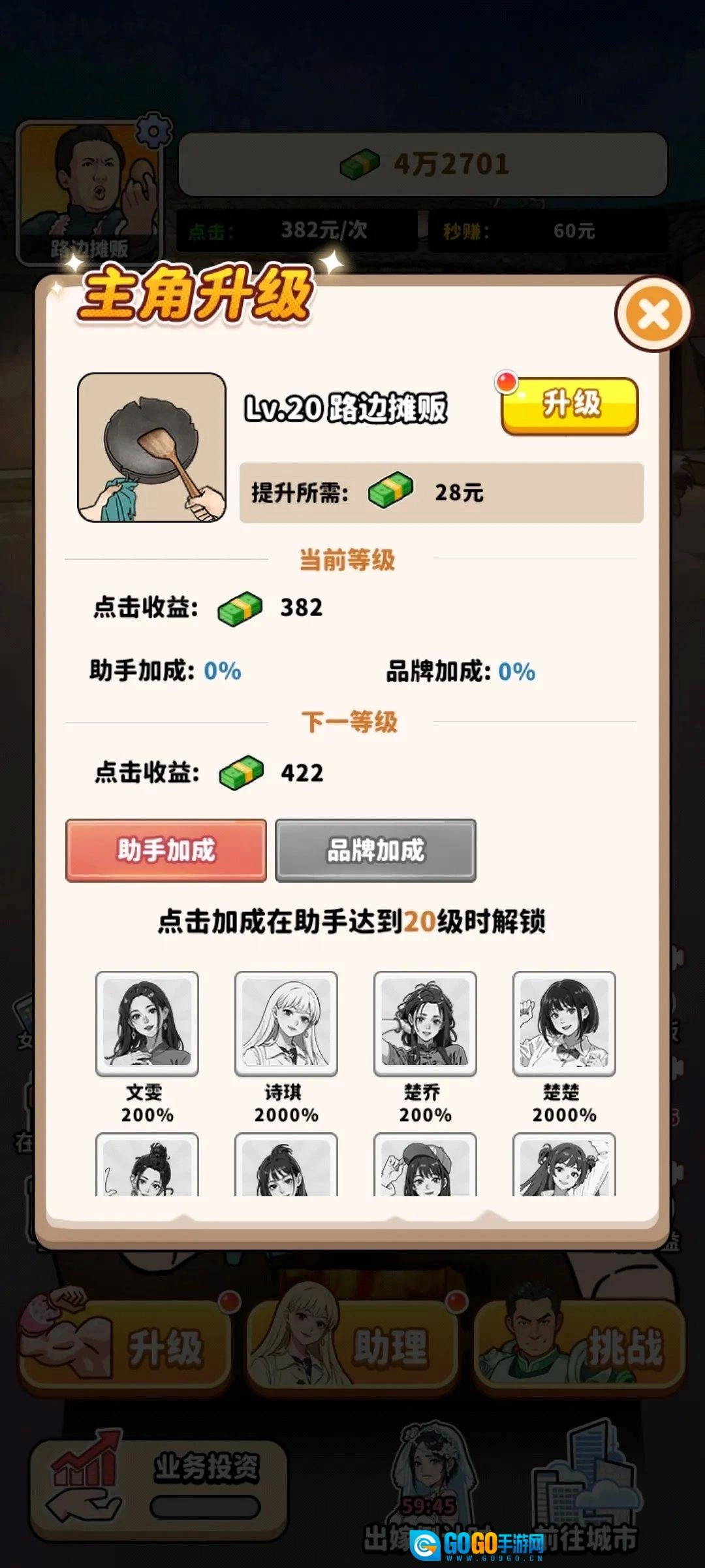 升级主角:提升商店等级,利用获取的各类游戏道具助力玩家升级主角,解锁更多游戏玩法,增加金币收益,提升生产效率。