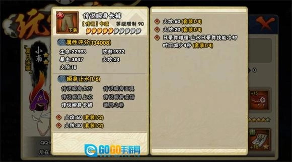 瞬身止水套装:这套忍具以传说中的瞬身止水命名,当穿戴四件时,使用止水的一技能冷却时间会减少4秒,其属性主要为火属性。