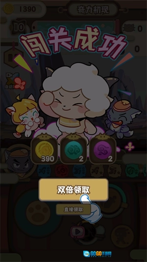 闯关成功后,点击“双倍领取”获得金币、技能。