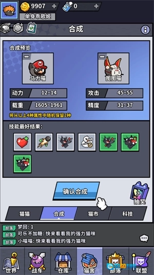 在这款游戏里,猫咪能够进行合成操作,它们的属性与技能在合成后有一定概率得到继承,这为玩家带来了层出不穷的惊喜体验。