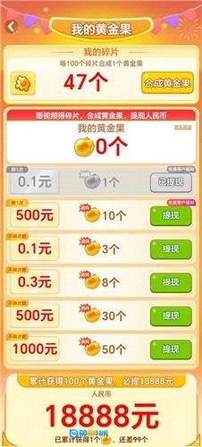 另一种方式是合成一个黄金果可提现0.1,之后合成3个黄金果才能提现0.1,且合成一个黄金果需要100个碎片。