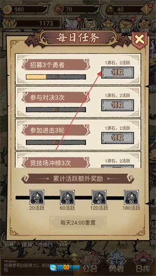 在每日任务页面,查看招募3名勇者之类的任务,完成后点击领取按钮来获取对应的奖励。