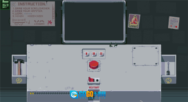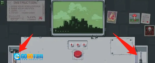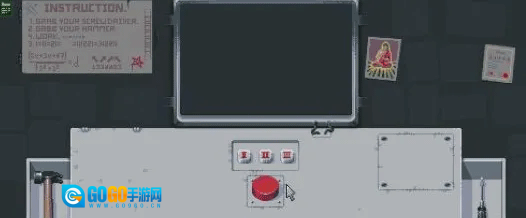 2.第二盏灯:按下中间的红色按钮,首次点击会显示下方的开关,第二次点击会呈现上方的罗马数字123。持续点击会自动弹出各类物品!点击第8次时又出现了一样东西,是一个拧螺丝的工具。继续按,第15次时左边的抽屉弹出一把羊角锤。当点击红色按钮到第20次时设备死机了!此时第二盏灯便成功被点亮了。