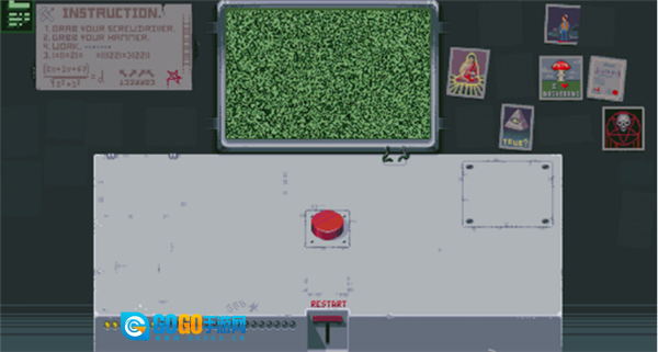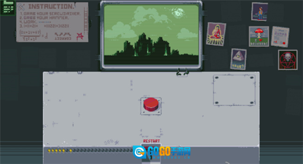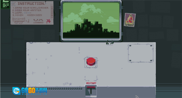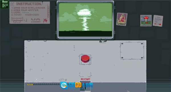 3.第三盏灯:首先点击RESTART按钮回到初始状态,在初始状态时点击一次红色按钮。随后会出现开关,此时点击一下开关,红灯便会亮起。接着再次点击红色按钮,控制台的左侧会开始进入倒计时。最后屏幕会出现原子弹爆炸的画面,之后就能点亮第三盏灯了。