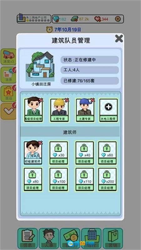 开局时招聘环节可以借助猎头服务,也可以通过观看视频的方式进行招聘,目标是招齐项目经理、工程、土建、水电等专家级人才,另外还需要招聘2名专家级建造师。之后,把商场里能获取的钻石都通过看视频的方式翻倍领取,以此解锁2个建造师的岗位空位。在人员配置完成后,着手建设100栋住宅、10栋洋房以及10间商铺。温馨提示:要等所有职位对应的人员都前来应聘后再进行招聘,这样能避免前期因人员未招满而造成资金浪费;而且等全部职位都招满了再动工建设,还可以提升房屋的品质。