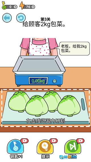 这是一款让我玩得超爽的休闲解压益智游戏。玩法很简单,玩家要通过和顾客聊天,搞清楚关键信息,然后给顾客切出合适的商品和重量。小清新的设计,清爽直观的界面,细腻精美的画面,加上顾客们千奇百怪的要求,再配上轻松愉快的背景音乐和音效,能让玩家完全沉浸在解压的快乐里。操作也很简单,就算是新手小白也能很快上手,在游戏中体验到独特的解压乐趣。