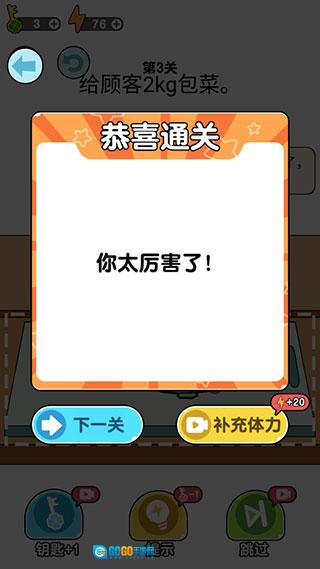 1、玩家进入关卡后,需依据客户提出的要求,为其切割出合适的蔬菜。