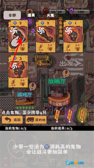 1、在鬼物选择界面,点击卡牌可将其编入队伍,冒险的基础准备要求至少携带4只鬼物才能出发。