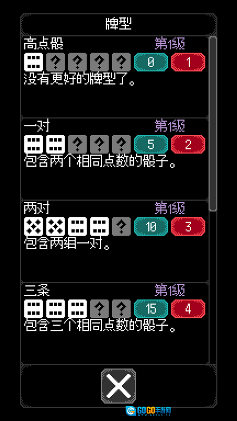 3、玩家需通过投掷骰子来构建不同牌型的牌组,不同牌型对应的得分各不相同。