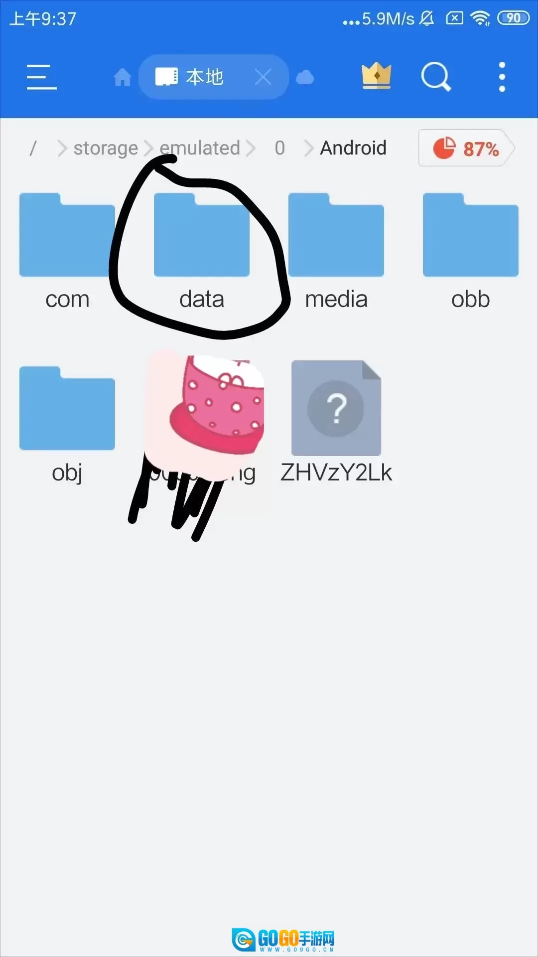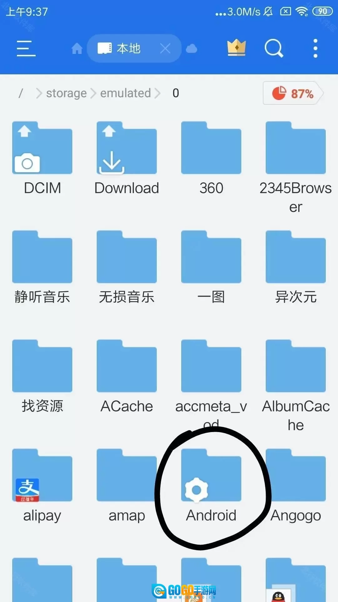 1、使用文件管理软件,打开Android文件夹