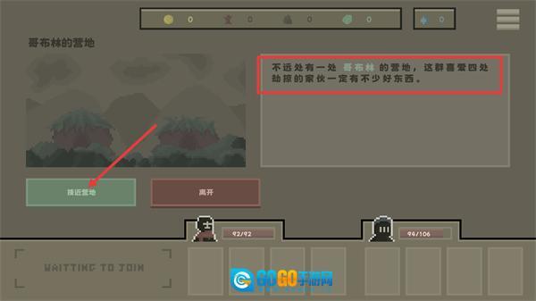 2、发现【哥布林的营地】后,界面会提示此处存有哥布林的物资,点击【接近营地】按钮即可对该区域展开进一步探索。