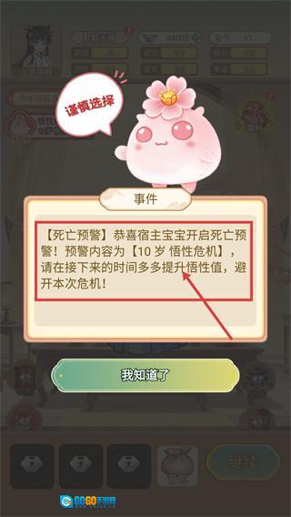 3、收到【死亡预警】提示【10岁-悟性危机】,请在后续提升悟性值以规避风险,点击【我知道了】即可关闭该提示。