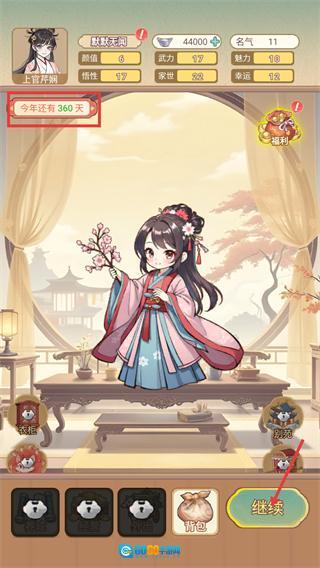 1、在当前界面,请注意查看【今年还有-360天】的时间提示,你可以借助【衣柜】【别苑】功能进行互动,点击【继续】按钮就能推进游戏流程。