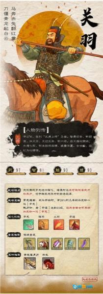 武将传记:与刘备张飞情同兄弟,雄壮威猛,号称“万人敌”。擒于禁、杀庞德,威震华夏。