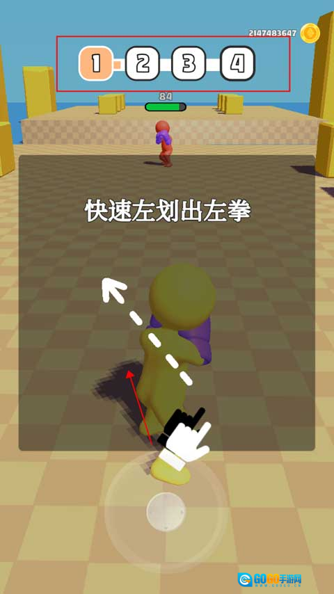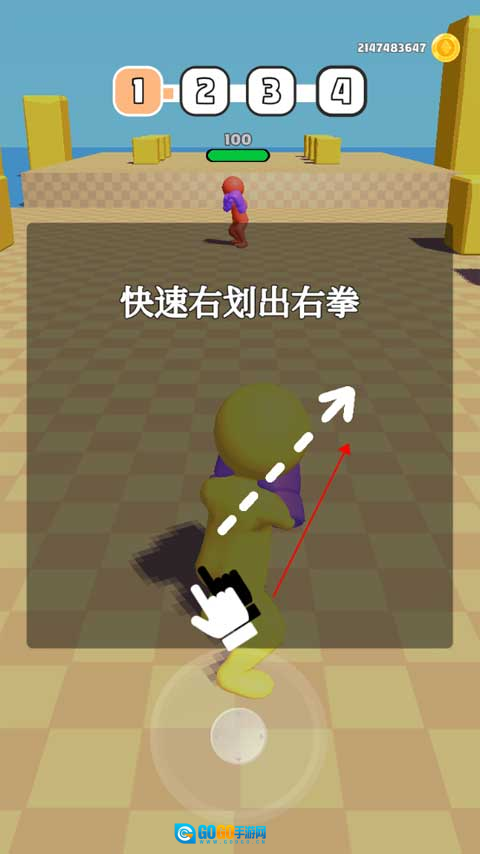 1、游戏的玩法十分简单,玩家通过左右向上滑动屏幕来发动攻击、出拳击败敌人;向下滑动则能后退以躲避敌人的攻击。