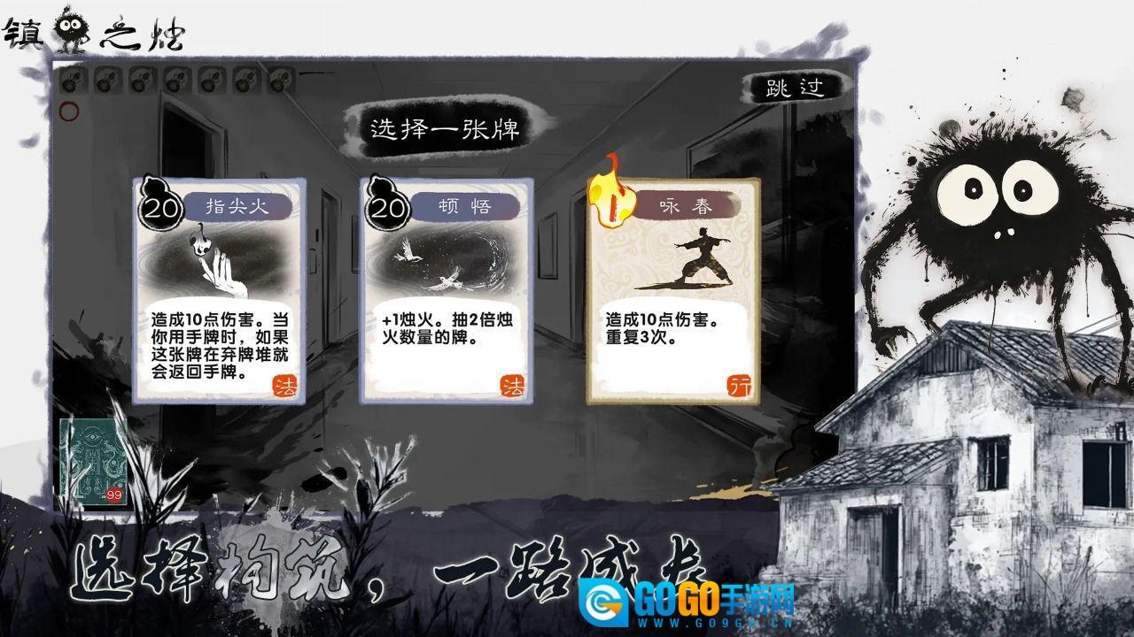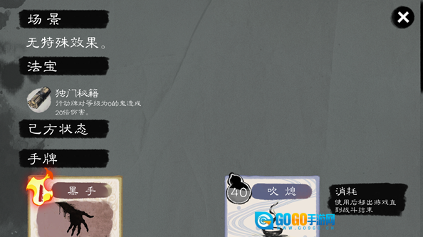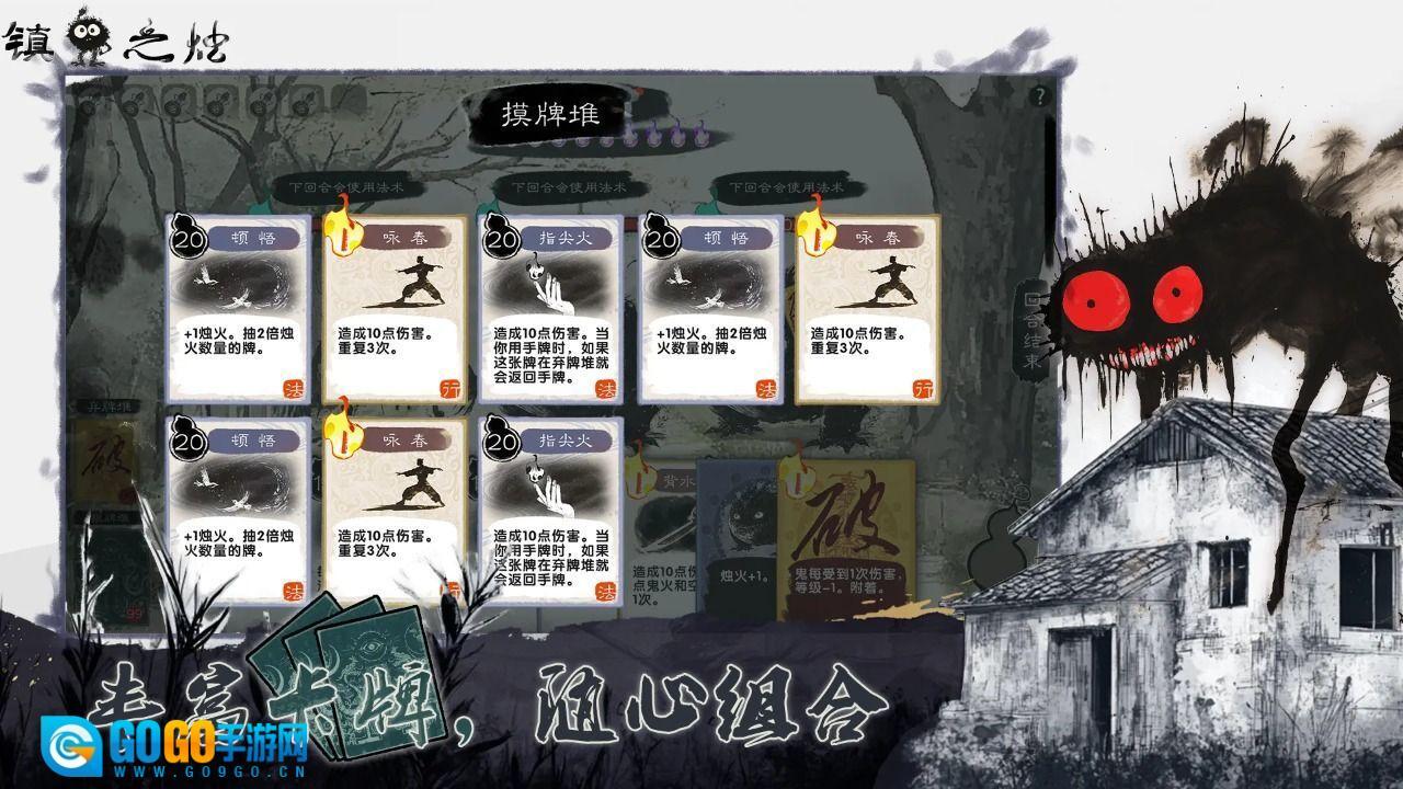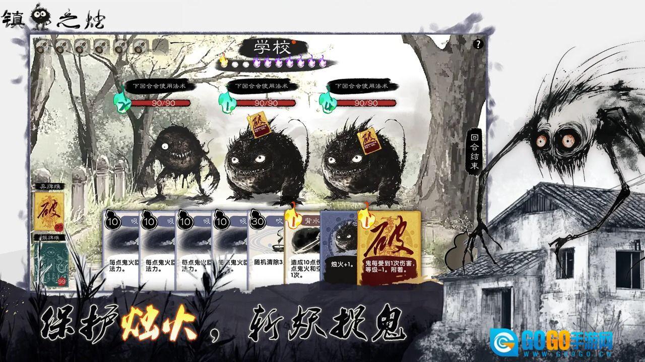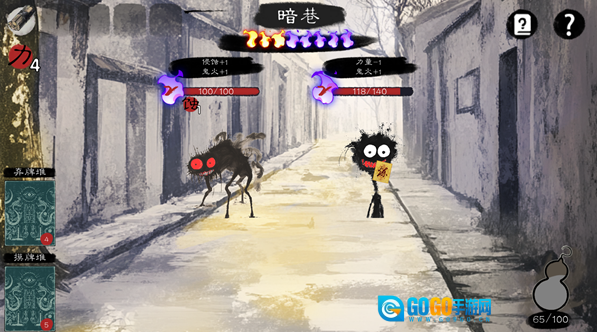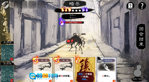 鬼卡牌会显示等级与血量信息。消除对应的鬼火能够降低鬼的等级。当所有的鬼或者鬼火被清除时,战斗就宣告胜利。
