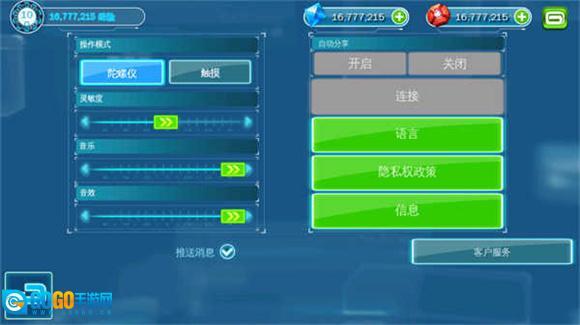 4、在选项设置中,我们能够更改语言、操作方式、音乐、音效、灵敏度等各项内容。