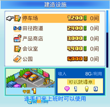 进入挂机阶段后,可建造的设施种类变多了,像温泉、快餐店(换成便利店也可以)都能建。等到了二周目转职阶段,这个阶段基本上就用不到灯泡了,只需要保留几家快餐店用来刷爱心,剩下的设施都换成健身馆就行。