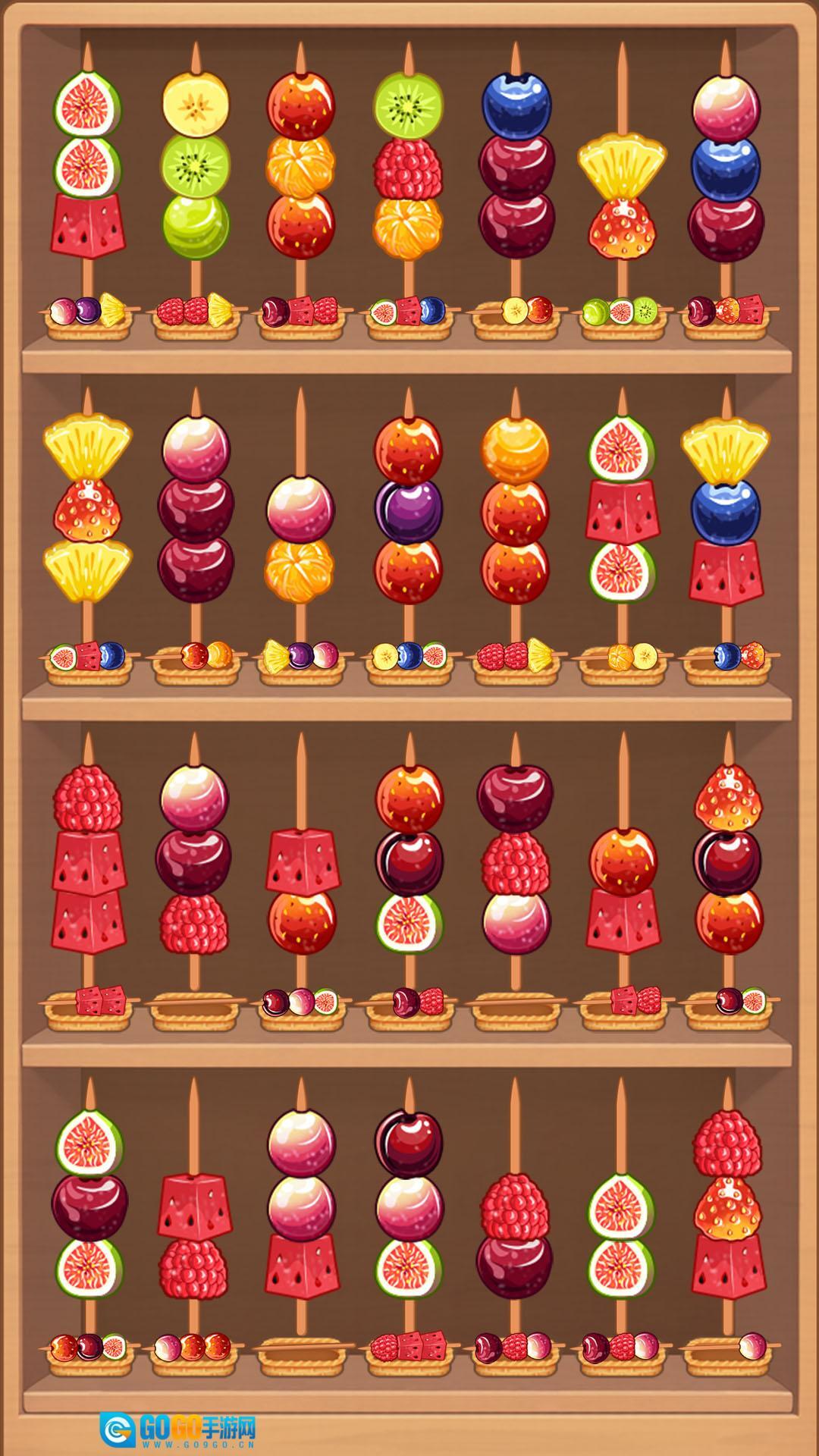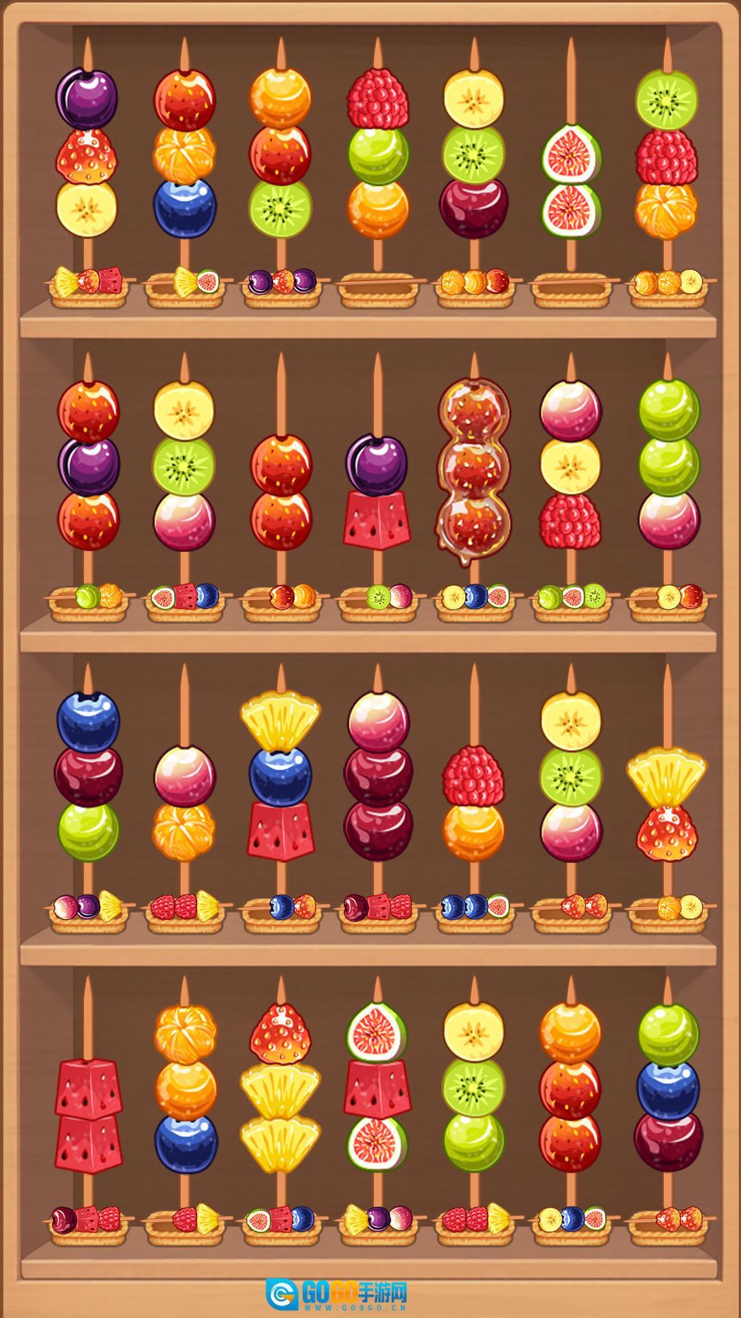 2、操作时要从签子的一端往另一端推进,比如从顶部开始的话,先把顶部附近的同种水果聚拢到一起,再一步步向下延伸;按照顺序推进比随意交换位置更容易串出完整的一串。