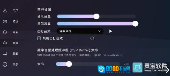 在音频设置模块,玩家可以调节游玩音量,以及调试缓冲区大小。