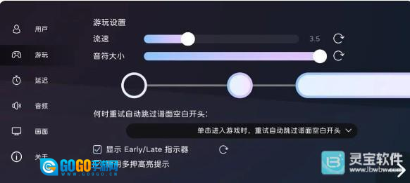 Early/Late指示器在获得非Max Perfect判定的时候会在游玩界面的连击左右提示本次判定的时间快慢,推荐追求高分的玩家开启。
