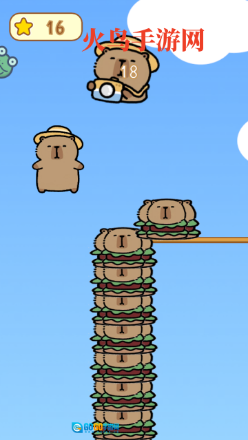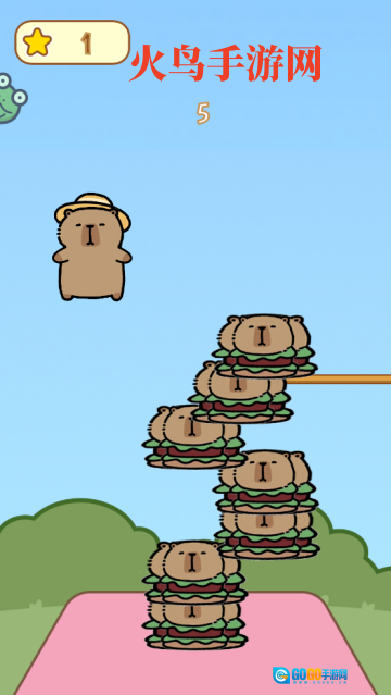 在这款游戏里,玩家要让萌萌的豚豚持续跳跃,看准合适的时机,把从侧边伸出来的汉堡一层层地堆叠起来。