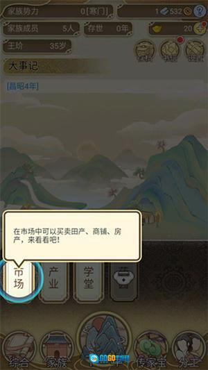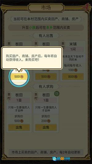 5、进入游戏后,左下角会出现一个【市场】入口,在这里可以进行田产、商铺、房产等资产的买卖操作。