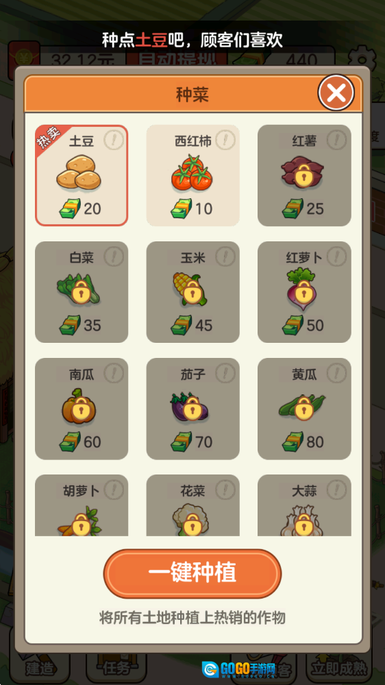 2、打开种植列表后,可自由选择作物,建议挑选热卖产品进行种植。