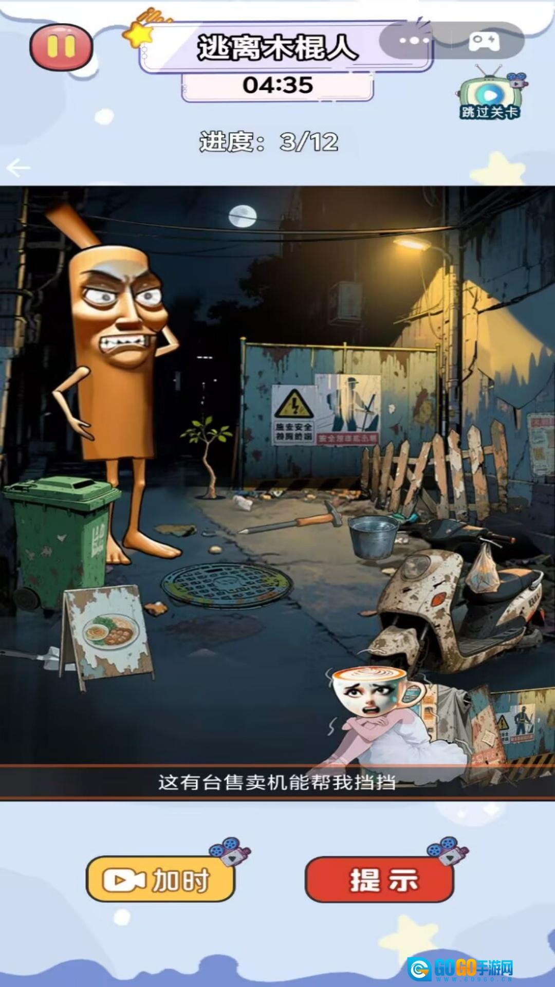 1、仔细观察场景里的各类物品,判断它们的遮挡效果,从中挑选出合适的物品,为咖啡小姐搭建一道屏障,这样就能防止她被木棍人发现了。