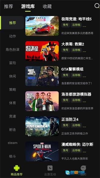 1、启动3A云游应用,进入主界面后,能看到推荐、游戏库、联机专区和收藏这几个频道;当前处于推荐频道时,可浏览到系统推送的各类游戏。