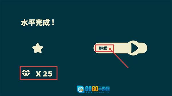 4、关卡完成后可获得【钻石×25】奖励,点击【继续】按钮进入下一关,积累钻石可解锁更多游戏内容。
