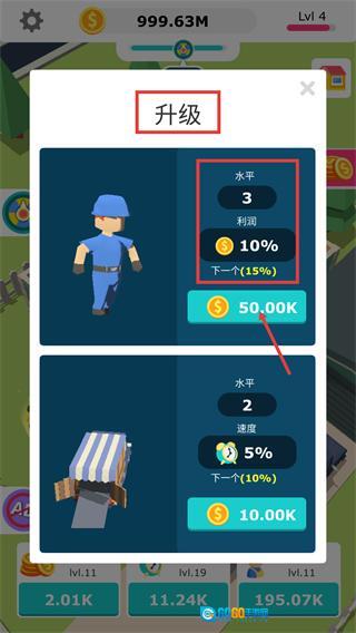 1.团队升级:在【升级】界面,花费【50.00K】金币为工人升级,这一操作能提升【利润-10%】等重要属性,从而有效增强资源获取的效率。