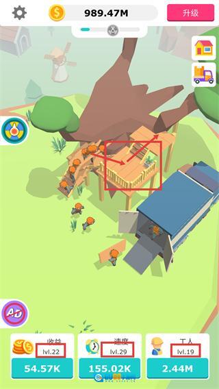 3. 自动建设功能:工人会自主开展建筑施工。提升【收益】【速度】等相关属性,能够加速工程推进,进而解锁更多可供建设的区域。