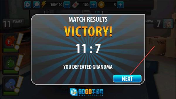 4、对战胜利后出现MATCHRESULTS界面,显示以11:7击败GRANDMA,点击NEXT按钮,即可进入下一场赛事挑战。