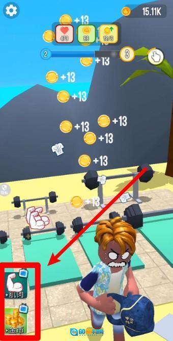 完成训练后,你能获取金币和肌肉值,左下角会展示当前的增益类型。金币可以用于升级设备,从而提高训练效率和产出倍数。