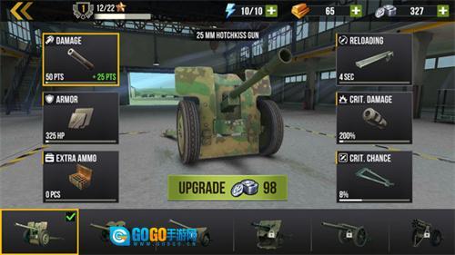 1、玩家进入游戏后,可先点击MY GUNS进入车库,选择要操作的火炮,还能对其进行升级;