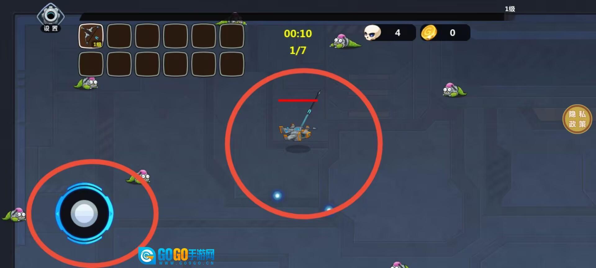 1、游戏界面顶部会显示当前敌人波次的相关信息,左下角是移动控制区域,角色的生命值显示在上方位置,当遭遇大量敌人时,玩家可以选择进行战术性撤退。