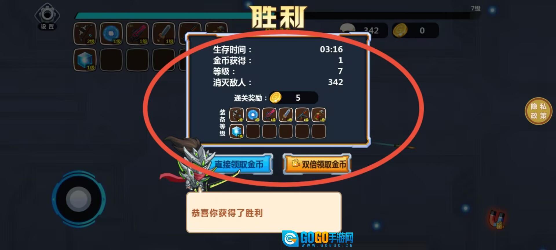 3、在成功扛住七波敌人的攻势后即可通关,结算页面会清晰呈现生存时长、金币获取量、等级成长情况以及击杀总数等各项数据。