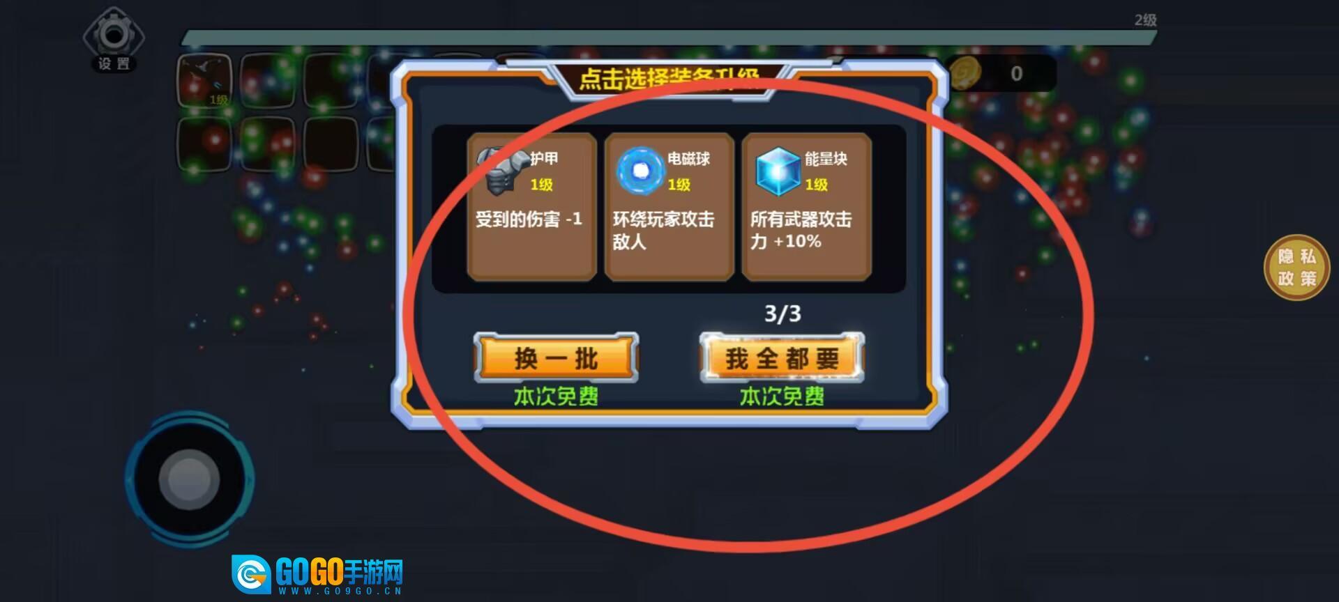 2、角色拥有自动攻击的能力,在击败敌人后会掉落蓝色能量球,收集这些能量球能够填充界面顶部的进度条,当进度条蓄满时,就会触发技能选择或升级的界面。