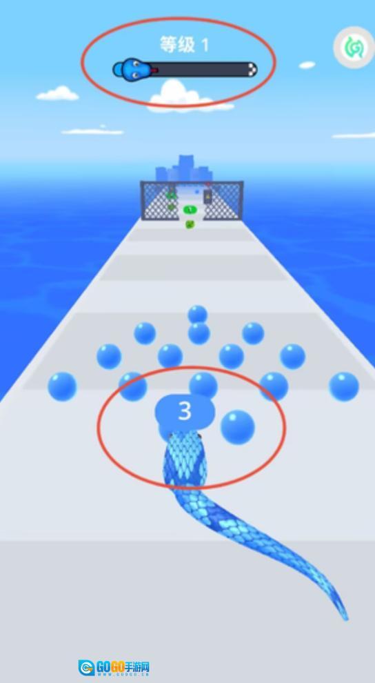 2、游戏顶部会展示当前关卡的相关信息以及进度条,玩家可以通过左右滑动来操控移动方向,并且能够吞噬其他蛇类和能量球体。