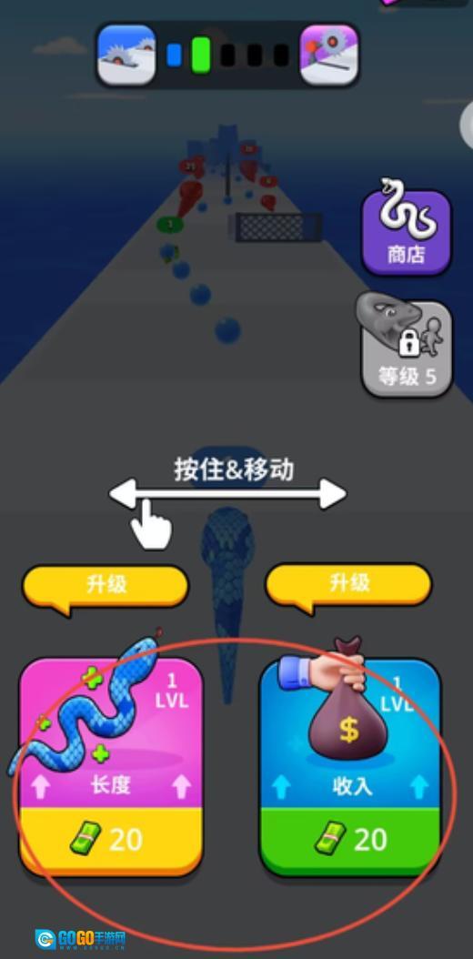 1、点击界面底部的升级图标,消耗对应数量的钞票,就能提升蛇身的长度,同时还能获得收益加成的效果。