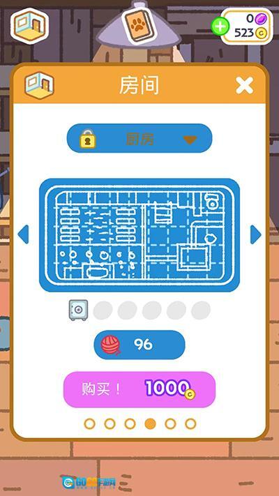 如图所示,点击界面上的【三角形】按钮,就能切换到不同的房间场景。当你收集到对应数量的毛绒球和金币后,就可以解锁新的房间了。