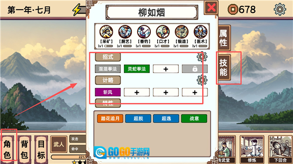 10、点击【角色】进入【技能】界面,玩家能选择携带上阵的招式与计略,并且随着角色境界的提升,可携带的招式和计略数量也会相应增多。