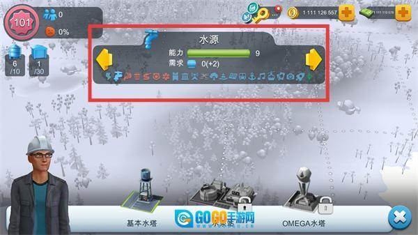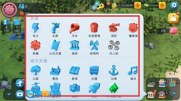 1、在资源界面选择【电力】【水源】等城市配套模块,即可建设对应的设施,以此满足城市发展的需求。